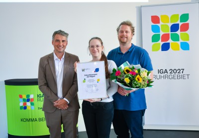 Die Delegation der Stadt Gladbeck mit der Urkunde: Dr. Volker Kreuzer (Erster Beigeordneter und Stadtbaurat), Paula Stegert (Projektleiterin 37° Nordost) und Alexander Selbach (Projektteam 37° Nordost) © IGA 2027/Rupert Oberhäuser -